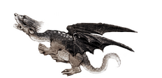 A short neck runs down from its head and into a slim body. The top is covered in narrow scales and rows of fan-like growths runs down its spine.her bottom is covered in thick skin and is colored lighter than the rest of its body. Two huge limbs carry its body and allow the creature to stand arrogantly and tall. Each limb has 4 digits, each of which end in barbed nails seemingly made of obsidian.Graceful wings grow starting from its shoulders and end just passed its shoulder blades. The wings are almost butterfly-like, a specialized layer of skin is all that's visible inside and armor-like scales grow on top of the wing's primary bones.