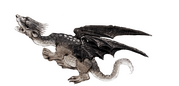 A short neck runs down from its head and into a slim body. The top is covered in narrow scales and rows of fan-like growths runs down its spine.her bottom is covered in thick skin and is colored lighter than the rest of its body. Two huge limbs carry its body and allow the creature to stand arrogantly and tall. Each limb has 4 digits, each of which end in barbed nails seemingly made of obsidian.Graceful wings grow starting from its shoulders and end just passed its shoulder blades. The wings are almost butterfly-like, a specialized layer of skin is all that's visible inside and armor-like scales grow on top of the wing's primary bones.